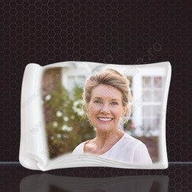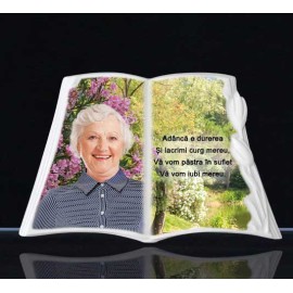 Fotoceramica funerara model carte Lalea, culoare alba, poate si imprimata alb negru, sepia sau color, editarea se poate face pe ambele pagini cu text sau poza, oferim gratuir editarea foto + 1 preview..